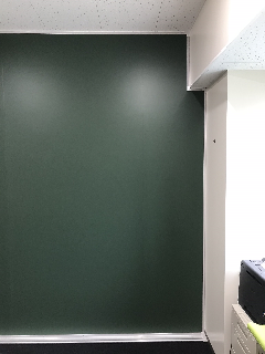 大学の研究室に、壁一面の平面黒板を導入いただきました。 スペースを気にせず、大人数で同時に書き込むことが可能です。